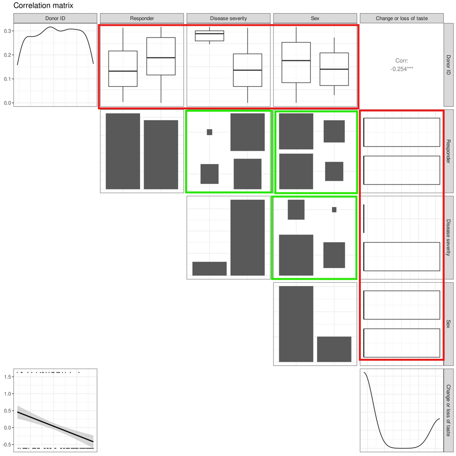 To illustrate the differences, we produce a plot with a mix of categorical variables (such as severity of SARS-CoV-2 disease symptoms, `Disease severity`, outcome of immune response durability at 6 months, `Responder`, and gender of participants, `sex`) and numerical variables (such as `Donor ID` and disease symptom `Change or loss of taste`)&#x20;